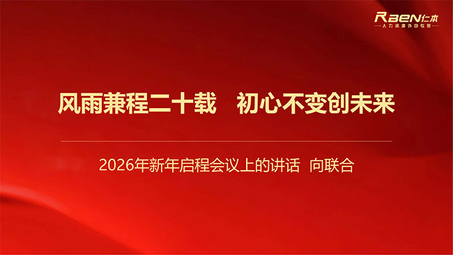 董事长致辞:初心不变创未来 作为本次动员会的重磅环节,董事长向联合以“风雨兼程二十载,初心不变创未来”为主题发表总结演讲。他从仁本二十年的发展历程讲起,回顾创业初心的坚守,剖析当前人力资源行业的最新风口,明确指出公司未来的战略方向。