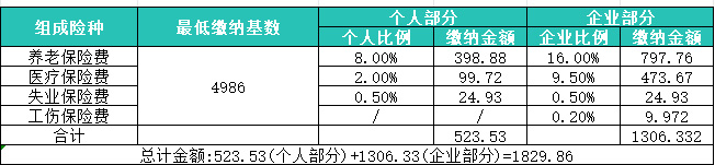 企业职工每个月最低缴纳多少?(以最低缴费基数4986为例) 4986×8%(养老保险)+4986×0.5%(失业保险)+4986×2%(医疗保险)=523.53元/月